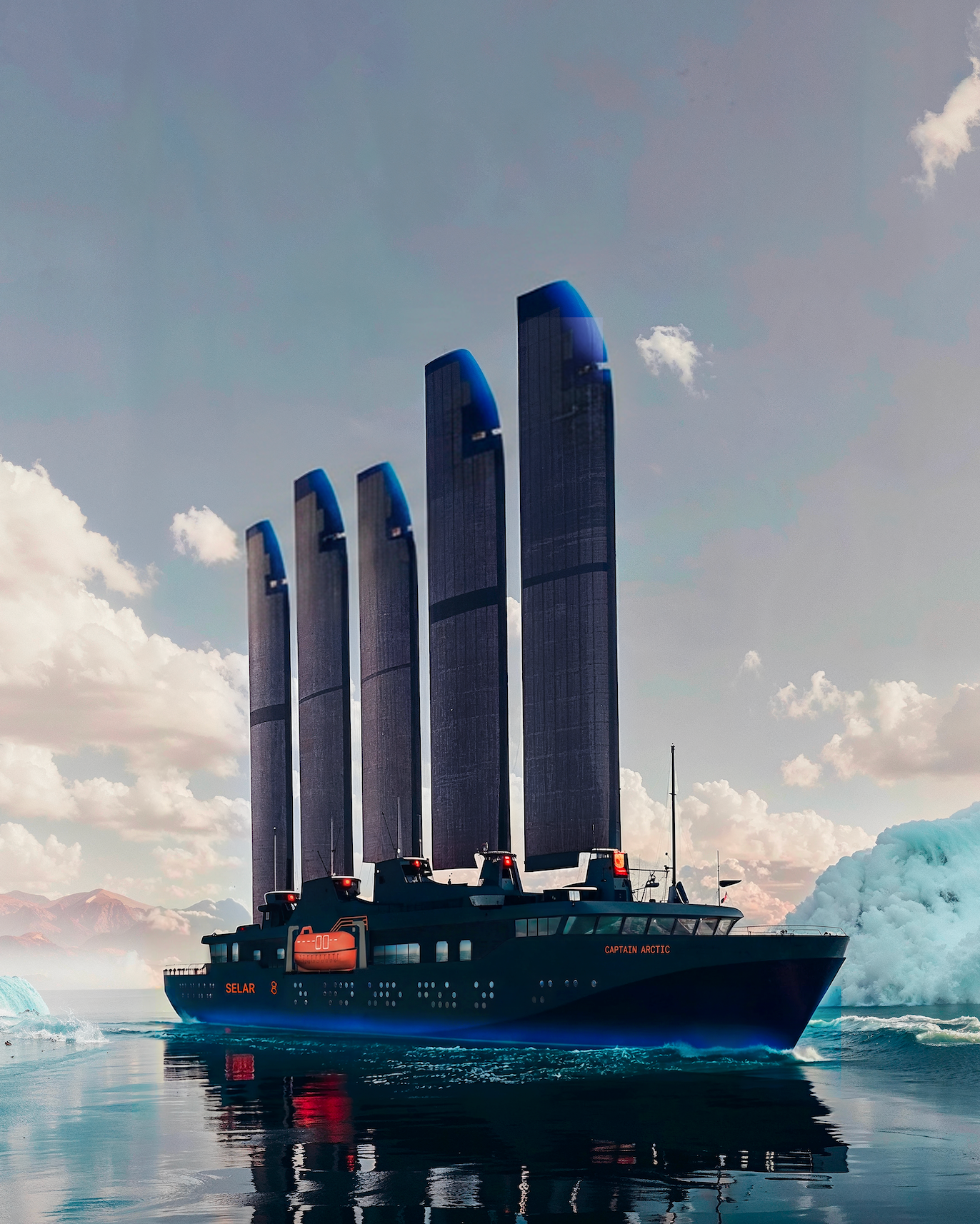 1. SOLAR SAILS : Our 35-meter-high sails can be retracted like a Swiss Army knife when needed. Built to endure the harshest weather, they are made of aluminum and fitted with 2000 m² of solar panels.
